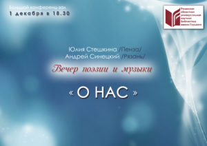 Вечер поэзии и музыки - что может быть волшебнее в первый день зимы? 1 декабря в 18.30 в Большом конференц-зале Рязанской областной библиотеки имени Горького прозвучат стихи молодой поэтессы из Пензы - Юлии Стешкиной, а великолепное музыкальное сопровождение подарит талантливый рязанский пианист - Андрей Синецкий.