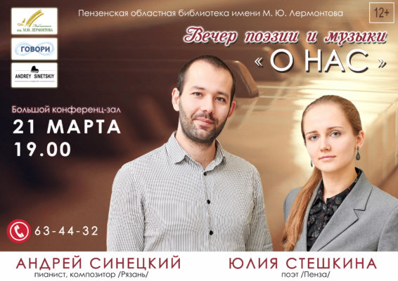 Вечер поэзии и музыки - так начинается настоящая Весна! 21 марта в 19.00 в Большом конференц-зале Пензенской областной библиотеки имени М. Ю. Лермонтова в рамках празднования Всемирного дня поэзии прозвучат стихи молодой поэтессы из Пензы Юлии Стешкиной, а великолепное музыкальное сопровождение подарит талантливый рязанский пианист и композитор Андрей Синецкий.