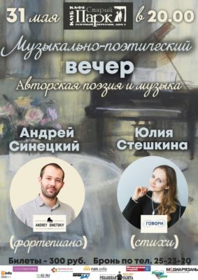 31 мая в 20.00, в последний день весны - авторская поэзия и музыка от поэта Юлии Стешкиной (Пенза) и композитора и пианиста Андрея Синецкого (Рязань) в кафе-клубе "Старый Парк" (Рязань). Музыкально-поэтический концерт "О нас" - это удивительная история творческого союза поэта и музыканта, мужчины и женщины, жителей двух разных городов, которых объединило творчество в его […]
